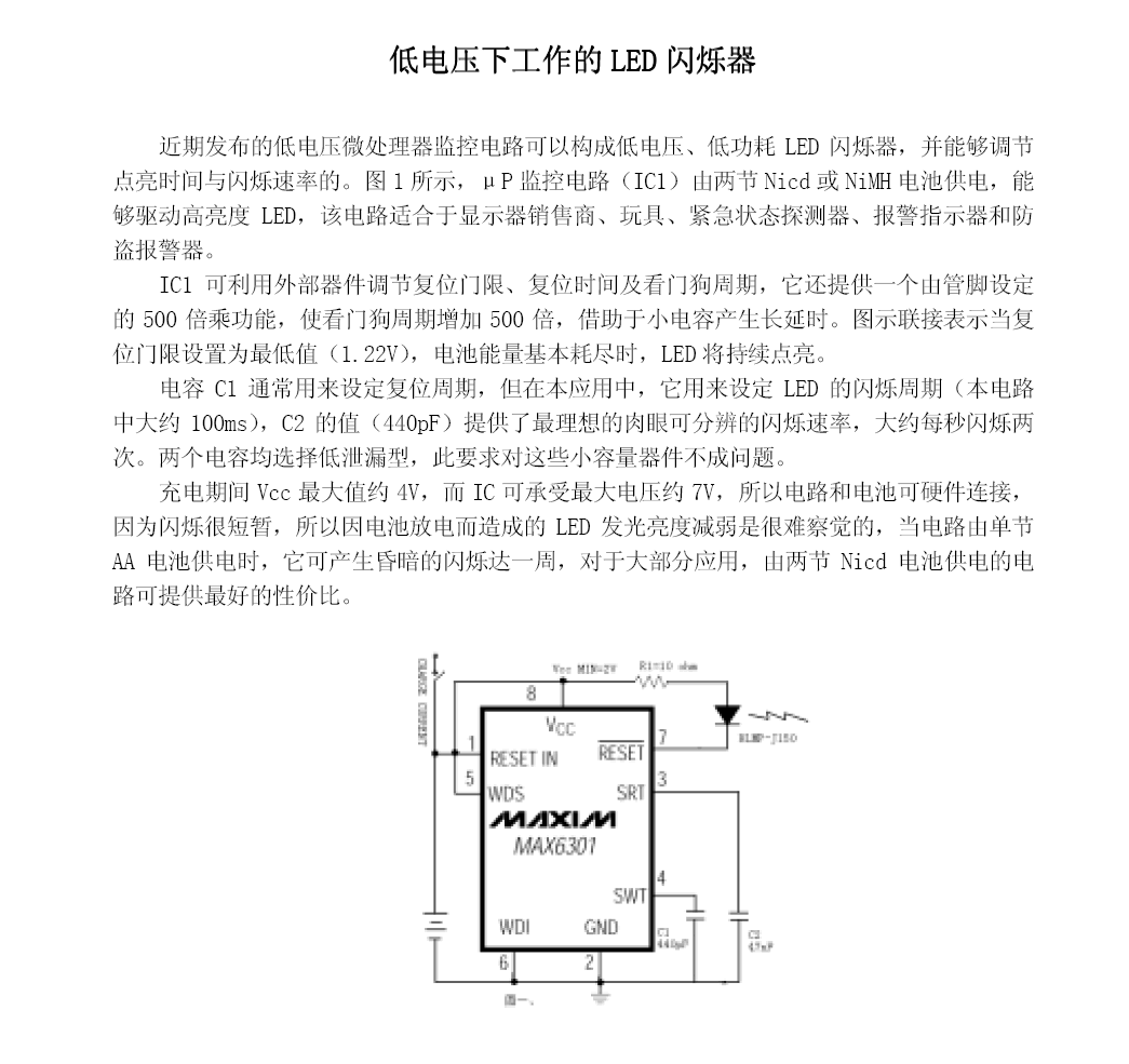 近期发布的低电压微处理器监控电路可以构成低电压、低功耗LED闪烁器,并能够调节点亮时间与闪烁速度的。(详细请点击下图放大查阅)