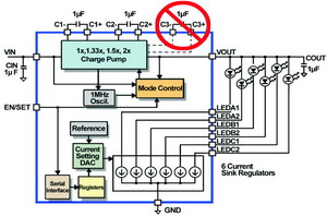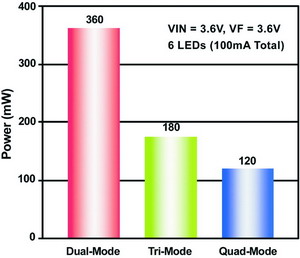 另一方面,电荷泵型LED驱动器则提供了一个非常好的解决方案,其外部电路只需使用极小的电容即可。这使之成为进一步推动消费增长的更小更薄的便携式设备的理想选择。电荷泵上的各个电流通道使用匹配的电流独立驱动各并行连接的LED,但是,升压比例是离散的,由不同的运行模式(倍增因子)而定。可用的运行模式数量和当前的电池电压决定了整个电荷泵的电源效率。
