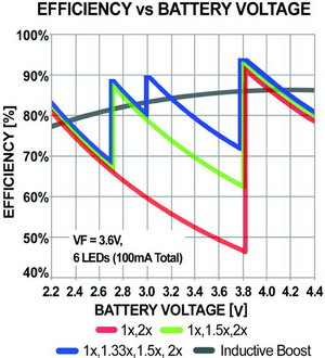 图1 通过增加一个1.33倍运行模式,电荷泵方案的效率相当于基于电感的方案