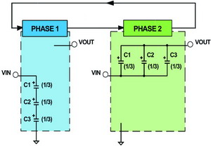在这种新的1.33倍升压架构中(图4),第一相动作是把飞电容C1和C2串联并通过输入电源为它们充电,第二相动作是把与输入电源相连的电容C1与C2断开并转接至输出端实现升压,与此同时,电容C2因与C1断开而保持浮空状态。第三相动作是串接C1和C2并串联于输入和输出间实现第二次升压,电容C1在这过程中是被反向接入的,因此,电容C1的正极被连接到输入电源,而电容C2的正极被连接到输出端。通过这三相操作,C1将被充电到输入电压的三分之一,C2将被充电到输入电压的三分之二,这就可以把输出电压升高到输入电压的三分之四(4/3)倍。