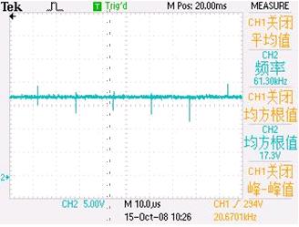 图 4 是 MOS 管栅极的波形,这是典型的门驱动脉冲波形,频率基本是固定的,脉冲的占空比随着负载电流和输入电压变化。当负载固定时,输入电压降低占空比增大,最低工作电压下的占空比是 0.48。脉冲幅度是固定 14.8V,不应该随输入电压升高而增加。测量中可看到脉冲在水平方向抖动,这并不是故障,而是为了降低 EMI 在芯片里增加了扩频功能。