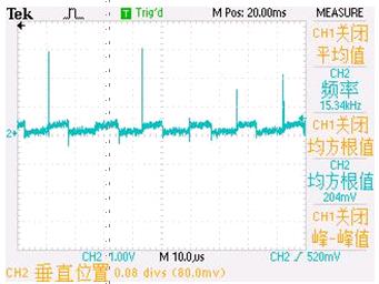 图 6 是 MOS 管源极电压,这个电压是 MOS 管的工作电流在传感电阻上的压降,它的幅度与 MOS 管的工作电流成正比。这个电压在单周期里送到芯片中作为控制信号,控制MOS 管栅极脉冲的占空比,使流过 LED 的电流恒定。源极电压与栅极电压的最大不同是脉冲前后沿有尖峰,尖峰是由输出镇流电感和MOS 管的寄生电感产生的,这些尖峰是产生开关损耗的根源。波形的顶部的斜坡是由导通损耗产生的。导通损耗和开关损耗是 MOS 管发热的主要原因。