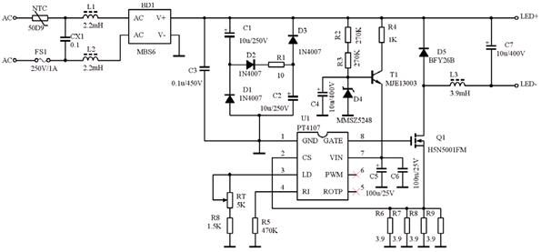 电路见图 1,交流市电入口接有 1A 保险丝 FS1 和抗浪涌负温度系数热敏电阻 NTC。之后是 EMI 滤波器,由 L1、L2 和 CX1 组成。BD1 是整流全桥,内部是 4 个高压硅二极管。C1、C2、R1、D1~D3 组成无源功率因数校正,工作原理见本公司《用 PT4107 设计 LED 日光灯的优化方法》一文。PWM 控制芯片 U1 和功率 MOS 管 Q1、镇流电感 L3、续流二极管 D5组成 Buck 降压变换,U1 采集传感电阻 R6~R9 上的峰值电流,由内部逻辑控制 GATE 脚信号的脉冲占空比进行恒流控制。芯片由 T1、D4、C4、R2~R4 组成的电子滤波器降压后供电,这个滤波器内阻很高,输出阻抗很小,能提供约 16V 稳定电压,确保芯片在全电压范围里稳定工作。R5 是芯片振荡电路的一部分,改变它会调节振荡频率。电位器RT 在本电路中不是用来调光,而是用来微调恒流源的电流,使电路达到设计功率。本电路的参数是为22个LED串联,15串并联,驱动330个60毫瓦的白光LED设计的,每串的电流是17.8毫安。