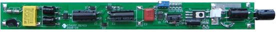 图2是恒流源的实际照片,33个元件安装在235×25×0.8 毫米的环氧单面印制板上,PCB走线是按电力电子规范要求设计的,可以直接安装在28毫米的灯管之中。