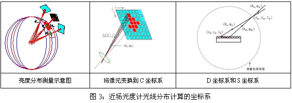 全空间分布光度的测量包括近场测量、远距离测量以及软件的校准和推导计算。远距离测量与传统方法相似,在距光源或灯具较远处测量其照度和光强值。近场分布光度计是全空间分布光度测量的关键,近场分布光度计由分布光度计和具有2维CCD阵列的成像亮度计组成,成像亮度计能够通过一次取样测得光源或灯具在某一方向的发光平面内各点的亮度值。