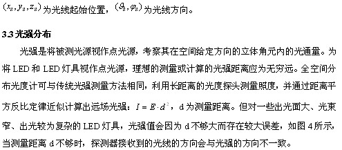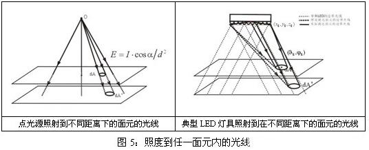 ,来计算各个距离下的照度分布、平面等照度曲线、空间等照度曲线等空间照度分布特性的。如图5所示,对于点光源,这种方法是合适的;但是对于复杂的LED和LED灯具,至少由于以下两点会存在较大误差,尤其是在计算距离较近的照度分布时,这会给灯具设计和照明设计带来误导: