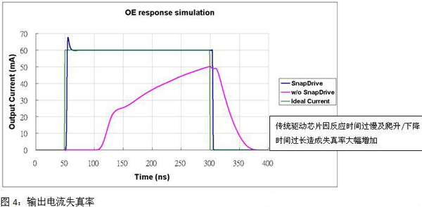 仿真条件:传统驱动芯片:Ton:160ns,Tof:70ns SnapDriveTM驱动芯片:Ton:15ns,Tof:15ns Vin:5V,Iout=20mA,LED等效电路RL:52Ω,CL:10pf OE脉冲宽度为:250ns