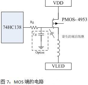 扫描屏上;建议在MOS的Gate端与74HC138之间串一个电阻,以避免VLED端的电感效应及MOS端寄生电容所产生的突波,造成74HC138烧毁;建议Rg<100Ω、Cg<47pF(电容部份可选择不加)。