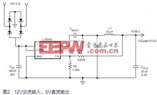 直流输入系统可以作为变压器将较宽的输入电压直接转化为5V,而这也是最为容易和简便的解决方案。典型的解决方案包括风扇和Synjet所需的驱动电流介于100~600mA方案。LM2841能够为小型冷却系统提供300mA的电流,LM2842能够为体积更大、功率更强的冷却系统提供高达600mA的电流。图1给出的LM2842设计输入电压为12V直流或者24V直流,可以提供必需的5V电压。整个方案可以提供高达600mA的电流,却只占用了大约1/4的PCB(印制电路板)面积,从而使得它可以很容易地嵌入任何改进装置之中。LM2841基于完全一样的设计,专门针对较低的电流应用,同时还允许使用小型的物理电感,从而占用更小的空间。