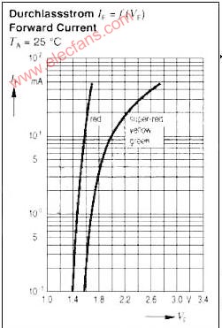 假定工作于10mA正向电流的绿光LED应该有5V的恒定工作电压,那么串接电阻RV等于(5V-VF,10mA)/10mA=300。如数据表中所给出的典型工作条件下的曲线图(图2)所示,其正向导通电压为2V。