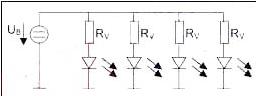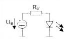 用一个电压源通过串接一个电阻与LED相连,LED就能正常工作, 只要工作电压(VB)保持恒定,LED就可以发出恒定强度的光(尽管随着环境温度的升高光强会减小)。