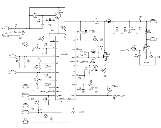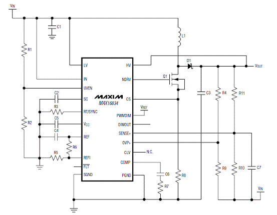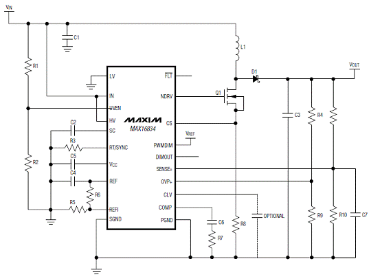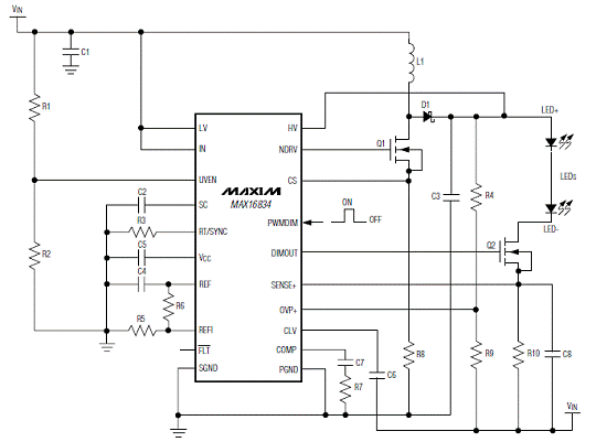 图3.MAX16834升压-降压LED驱动器(VLED+ < 28V)