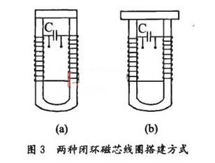 在磁芯材料确定的情况下,为了得到较大磁感应强度B,需改变线圈中磁芯的结构。若磁芯结构设计为环形,由式(8)知,磁感应强度B增大倍数理论上与磁芯的相对磁导率卢,大小相等,检测信号幅值将达到最大。与条形磁芯同种材质的u型磁芯上搭接一块条形磁芯就构成环形磁芯线圈,其搭接方式有两种,如图3示。