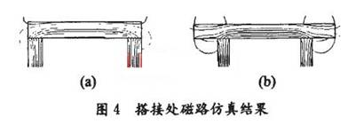 检测时将绕有线圈的U型磁芯的一端插入图1所示1闭合回路,感应LED支架回路中回路电流产生的交变磁通,再将条形磁芯搭接在U型磁芯上,使感应磁路闭合。由于搭接方式不同,两种搭接方式的磁芯线圈处在支架回路所产生的交变磁场中时,其搭接处磁路也将不同,用Ansoft MaxwELl软件仿真两种搭接方式的磁芯搭接处在交变磁场中的磁回路,结果如图4示