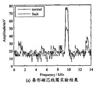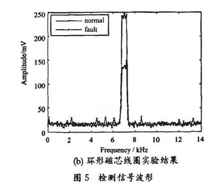 本文介绍的LED芯片封装缺陷检测方法是通过检测LED支架回路光电流间接实现的。由图5可以看出,支架回路光电流激发的磁场在不同磁芯结构线圈两端感生电动势大小不同;不同磁芯结构线圈,检测信号的信噪比差异较大。具体表现为: