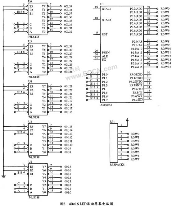 图2是LED滚动屏幕的电路原理图。该屏幕由10片8×8LED模块组成,分两排,每排5片。由于8×8LED模块只能显示数字,不能显示汉字,且显示一个汉字至少需要16×16点阵,所以,本设计采用4片8×8LED模块,可以同时显示2.5个汉字,图1中屏幕显示的是“动屏”两个字和“幕”字的左半边。滚动屏幕的显示由AT89C51来控制,屏幕不停地向左滚动显示“滚动屏幕设计”六个字。由于该屏幕有16行40列,其行和列引脚信号均由AT89C51控制,但AT89C51只有32个I/O口,所以,设计中使用了5片74LS138译码器来提供列控制信号,而行方向的16条引脚则接在AT89C51的P0口和P2口。74LS138的地址输入端和片选输入端由AT89C51的P1口控制。