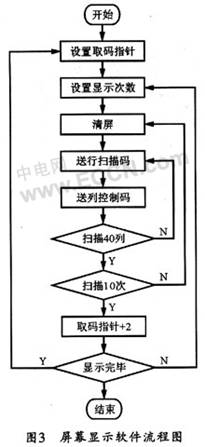 本文设计的LED滚动屏幕是通过AT89C51来进行控制的,而可实现向左滚动显示“滚动屏幕设计”六个文字的显示,其程序使用汇编语言来编写完成,流程图如图3所示。设计时先由控制器的P0口和P2口送1~16行扫描码,由P1口来控制译码器送列控制码。在显示完第l列后,列控制码加1,再显示第2列,直到40列显示完,即显示完一屏。然后重新显示1~40列,反复显示10次,这样可使文字显示的时间更久些。当显示完第1屏,取码指针就加2(每一列是16位,两个字节),接着显示第2屏,即第2屏的第1列是第1屏的第2列,第3屏的第1列是第1屏的第3列,如此循环就出现了屏幕滚动显示的效果。直到6个文字全部显示完毕,再循环显示。