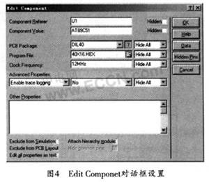 本设计在Proteus ISIS中命名为40X16,汇编语言程序命名为40X16.asm,点击菜单Source的下拉菜单第一条Add/Remove Source Files,在弹出的对话框中点击New,选择40X16.asm。然后在CodeGereration tool一栏的下拉框中选择ASM51,点击OK。这样,菜单Source的下拉菜单中就多了个40X16.asm。点击菜单Source的下拉菜单BuildAll,如果编译成功,会弹出BUILD LOG提示没有错误,如果程序中有错误,则编译失败,BUILDLOG也会对错误进行提示。编译完成后生成40X16.hex文件,在原理图中右键点击AT89C51,再点击左键,会弹出Edit Component对话框中,如图4所示,对其设置完后再点击OK,就可以进行仿真了。