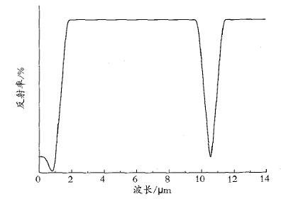 理想状态的激光/红外隐身涂层应在1.06μm和10.6μm具有极低的反射率,而在其他红外波段则具有尽可能高的反射率,如图1所示。然而这种材料实际上很难获取。近来,掺杂半导体成为激光隐身涂料的研究热点,掺杂半导体可作为涂料体系中的非着色颜料,经过适当选配半导体载流子参数可使涂料的红外和激光隐身性能都达到令人满意的结果,同时也不会防碍涂层满足可见光伪装的要求。掺杂半导体一般选用InO3或者In2O3和SnO2。通过掺杂使得等离子波长处于合适的范围,使材料在1.06μm处具有强吸收低反射,在热红外波段具有低吸收高反射,从而达到两者隐身兼容。