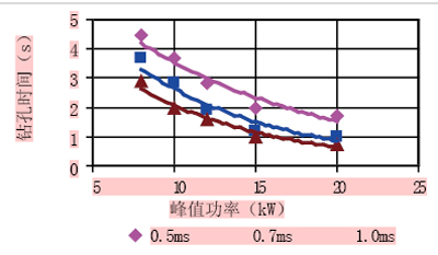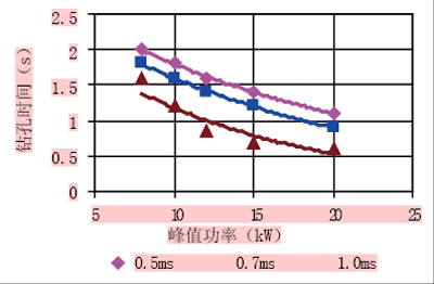 图8 不同脉冲宽度时的钻孔时间 (与表面成10角,JK704LD1,O2 辅助)
