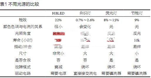 对HBLED(高亮度LED)的好处心知肚明的消费者会想办法尽可能多地使用HBLED。通过表1中的数据对比可以发现,显然HBLED是亮度最高的照明方案。