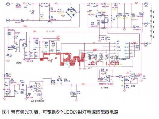 图1显示了一个由6个LED的适配器和调光电路组成的射灯方案的完整电路图。设计的核心(当然要把HBLED刨除在外)是ISL6745A控制器。右上角的器件组成了一个SEPIC控制器,驱动串在一起的6个HBLED。四周的放大器进行电流调整,短路保护和过压保护。在左下角,您可以找到交流调光电路。调光器的放大器输出先进行滤波,然后用作电流调整器的参考点,反馈到控制环路中。
