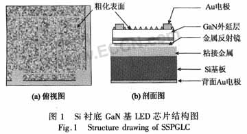 从结构图中看出,Si衬底芯片为倒装薄膜结构,从下至上依次为背面Au电极、Si基板、粘接金属、金属反射镜(p欧姆电极)、GaN外延层、粗化表面和Au电极。这种结构芯片电流垂直分布,衬底热导率高,可靠性高;发光层背面为金属反射镜,表面有粗化结构,取光效率高。