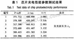 通过优化Si衬底表面的处理和缓冲层结构,成功生长出可用于大功率芯片的外延材料。采用Pt电极作为反射镜,成功实现大功率芯片的薄膜转移。采用银作为反射镜,大大提高了反射效率,通过改进反射镜的设计并引入粗化技术,提高了光输出功率。改进了Ag反射镜蒸镀前p型GaN表面的清洗工艺和晶片焊接工艺,改善了银反射镜的欧姆接触,量子阱前引入缓冲结构,提高了芯片发光效率,优化量子阱/垒界面生长工艺,发光效率进一步提高,通过改进焊接技术,减少了衬底转移过程中芯片裂纹问题,芯片制备的良率大幅度提高,且可靠性获得改善。通过上述多项技术的应用和改进,成功制备出尺寸1 mm×1 mm,350 mA下光输出功率大于380 mW的蓝色发光芯片,发光波长451 nm,工作电压3.2 V,完成课题规定的指标。表1为芯片光电性能参数测试结果。