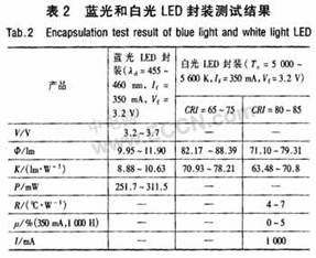 根据LED的光学结构及芯片、封装材料的性能,建立了光学设计模型和软件仿真手段,优化了封装的光学结构设计。通过封装工艺技术改进,减少了光的全反射,提高了产品的取光效率。改进导电胶的点胶工艺方式,并对装片设备工装结构与精度进行了改进,采用电热隔离封装结构和优化的热沉设计,降低了器件热阻,提高了产品散热性能。采用等离子清洗工艺,改善了LED封装界面结合及可靠性。针对照明应用对光源的光色特性的不同要求,研究暖白、日光白、冷白光LED颜色的影响因素:芯片参数、荧光粉性能、配方、用量,并通过改进荧光胶涂覆工艺,提高了功率LED光色参数的控制能力,生产出与照明色域规范对档的产品。蓝光和白光LED封装测试结果见表2。表中:φ为光通量;K为光效;P为光功率;R为热阻;μ为光衰;I为饱和电流。