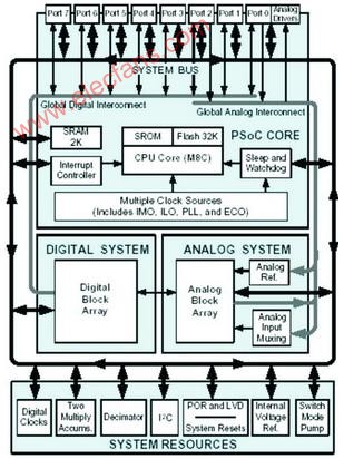 EZ-Color控制器是Cypress生产的专门针对高亮LED照明混色应用的可编程片上系统芯片。它主要由8位微处理器,可编程模拟模块和数字模块,外加硬件乘法累加器,I2C,Flash, SRAM等周边外围模块组成,如图1所示。