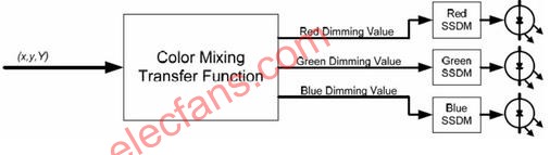 从上面的实现机制图可以看到,EZ-Color的LED混色方案是采用(x,y,Y)表示输入,输出是RGB三色LED,其中三色LED 的硬件驱动采用了SSDM(随机信号强度调制)用户模块。输入的(x,y,Y)是按照CIE 1931色度图的表征方法来表示EZ-Color的颜色输入请求信息,即x,y代表色调和色饱和度,反映颜色的色度信息,而Y代表光通量,反映颜色的亮度信息。SSDM用户模块是赛普拉斯的PrISM(精确照信号强度调制)技术的硬件实现。PrISM技术是赛普拉斯专有的LED亮度调节技术,它可有效地解决电磁干扰和低频闪烁问题。