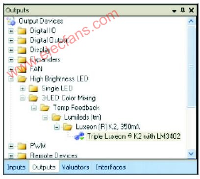 B. 从“输出驱动器”列表中的High Brightness LED下面选择Triple Luxeon K2颜色混合驱动器,并将其拖到工作区中(见图5)。在拖到工作区释放后,PSoC express会弹出一个添加输出驱动器窗口。这个时候输入驱动器ColorMixer作为HBLED驱动名称后,点击“ok”即可。