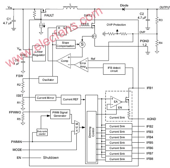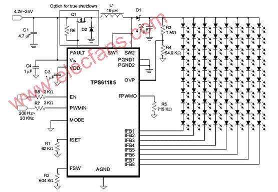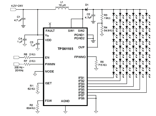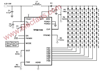 TPS61185是TI 公司的高度集成大尺寸LCD背光解决方案.器件包括内置的高效率升压稳压器和2.0A/40V功率MOSFET.8个电流沉稳压器具有高精度的电流稳流和匹配(1%),支持多达80个LED,每串串联多达10个LED.输入电压4.5V -21V, 开关频率600kHz 到1MHz,可调光频率从100 Hz 到5 kHz,主要用在笔记本电脑LCD显示器背光.