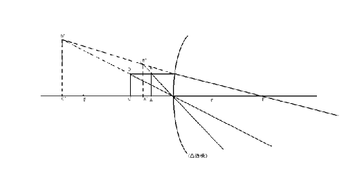 由图可知,当物体处于2F一F之间时,所成的像有放大作用,且越是靠近F点其放大倍率越高。例:如图AB和CD是同样大小的物体在经凸透镜成像后,分别成像是A’B’和C’D’。由于CD更靠近F点,所以像C’D’>A’B’但事实上操作起来,由于物体须在2F一F之间,所以距离放大镜较远。且所成的像为倒立的,要用附加设备才能使之正立,不容易直接视像,但通过光屏能接受到,我们称其为实象。所以手持放大镜不采用此种放大原理。