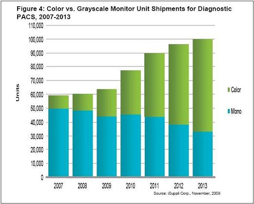 用于图像存档通信系统(PACS)的高性能诊断显示器,代表着当今液晶显示器(LCD)市场每英寸营业收入最高的市场机会之一。最初用于显示以前记录在黑白胶片上面的图像,灰度显示器长期以来统治着这个市场。但灰度不断改善的高亮度彩色显示器,逐渐在灰度显示器的海洋中获得立足点,而且是目前医疗显示器产业中最热门的增长机会之一。不同于近年来已进入负增长的灰度显示器,近年来对具备诊断级质量的彩色显示器的需求不断增加,随着客户青睐彩色显示器所提供的灵活性,需求有望在2010 年激增。