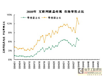 经过产业界的不断努力,这个新的尝试已经收到良好效果。根据奥维咨询(AVC)的监测显示,互联网电视自上市以来,一直是以高端产品的形象出现在市场上。作为一个新的平台,互联网电视还整合了最新的LED背光显示技术,融合了最新的外观和功能设计,这使电视的科技感和主推企业的产品形象都得到了很大提升,因此互联网电视自上市以来在市场上的认知度和占有率都有了快速提升。奥维咨询(AVC)的监测显示,今年国庆黄金周期间,互联网液晶电视的零售量占比达到6.5%,零售额占比已经达到11.9%,产品单价比传统的非网络电视,平均每台也要高出2000元以上。