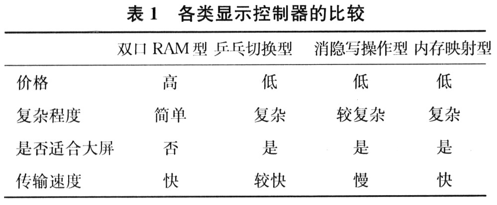 内存映射型控制器用一小块双口存储器做缓存,保证了显示数据传输的流畅性;显存定义在SDRAM/SRAM内存中,取代了独立显存从而降低了系统成本;使用中只需修改时序发生器,就可以驱动各种参数的显示器;同时,通过总线协调显存的读写操作,有效的避免了显存读写冲突问题。表1从4个方面对内存映射型控制器与其他3种常见控制器类型进行了比较。