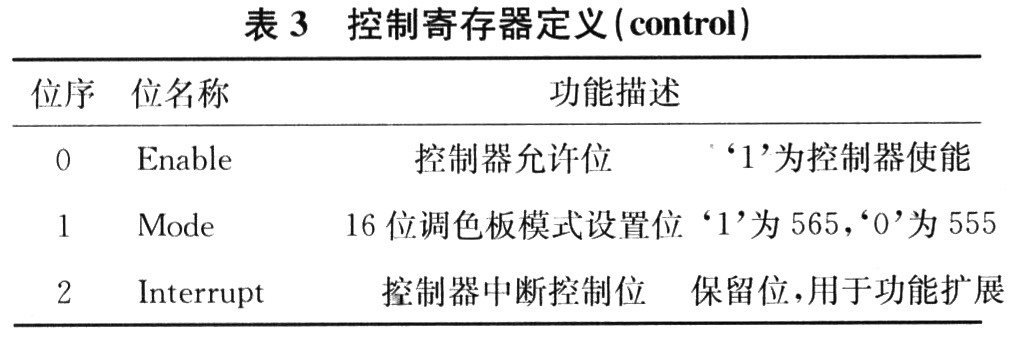 其中,显示参数寄存器(size)中“色数”标志位,值为1表示8位颜色显示,值为0表示16位颜色显示。状态寄存器(status)大小为两位,可与控制寄存器中的中断位(Interrupt)配合使用,为保留位。控制器寄存器的定义如表3所示。