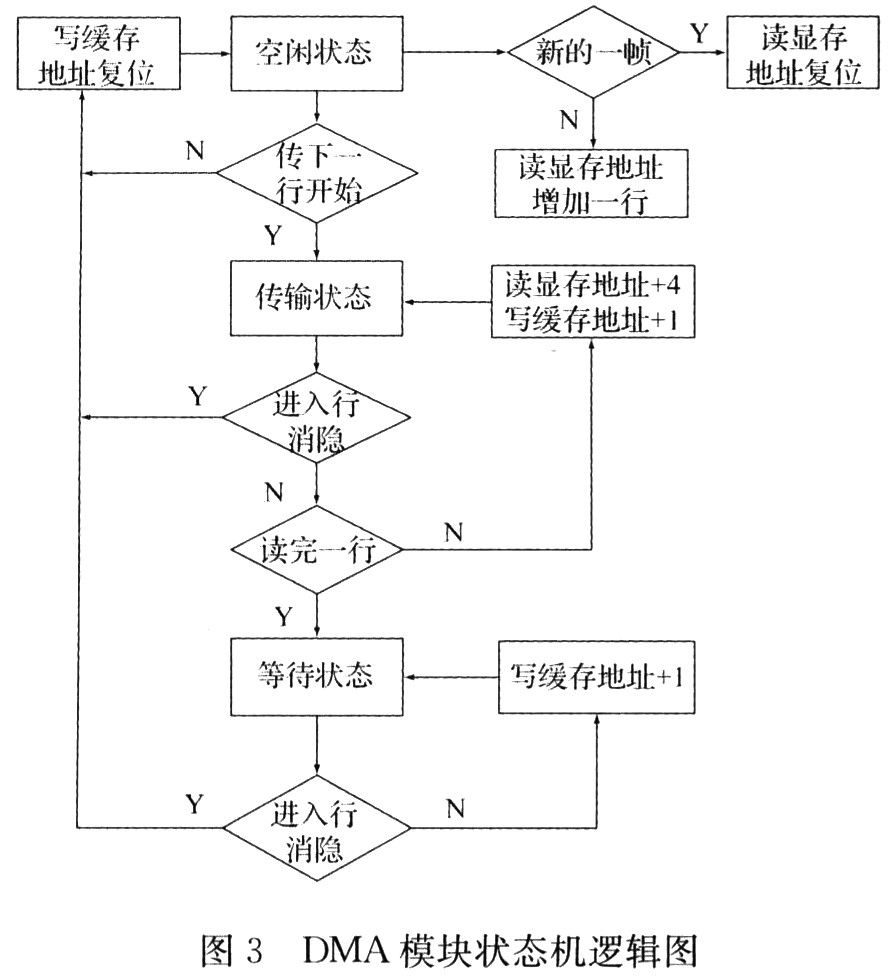 该模块为Avalon总线主端口设备,它负责向Avalon总线提供有效的地址、数据和写请求信号,并在时钟上升沿发起总线传输,读取显存中的数据;同时,DMA模块产生写数据缓存的地址和数据,将显示数据正确地从显存传送到数据缓存。DMA模块为三状态的状态机,包括空闲状态、传输状态、等待状态,各状态机逻辑关系如图3所示。