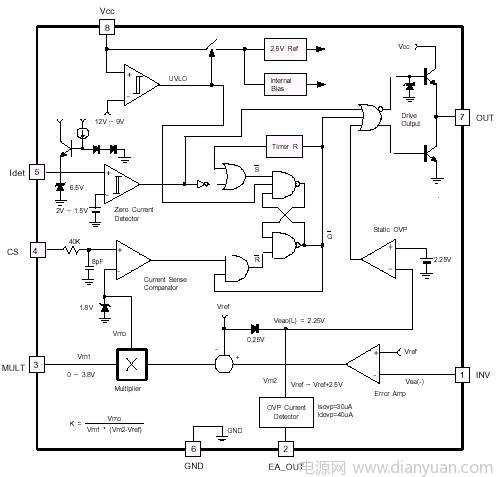 CS为来自MOSFET的电流传感输入信号。当乘法器输出超过该参考电流,触发器将触发,使OUT置为高电平,从而导通MOSFET。当Idet上检测到一个零交信号,OUT将被置为低电平,从而关断MOSFET。