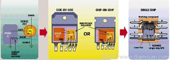 这些控制器体积小,会启发封装方面的一些考虑,如将一个用600V IC工艺制造的控制器与600V功率MOSFET (采用传统技术或电荷平衡技术) 集成在同一封装中。各种chip-on-chip和chip-by-chip模式已在世界各地的大批量应用中流行起来。
