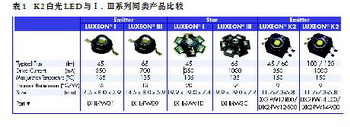 近年来,大功率LED发展较快,在结构和性能上都有较大的改进,产量上升、价格下降;还开发出单颗功率为100W的超大功率白光LED。与前几年相比较,在发光效率上有长足的进步。例如,Edison公司前几年的20W白光LED,其光通量为700lm,发光效率为35lm/W。2007年开发的 100W白光LED,其光通量为6000lm,发光效率为60lm/W。又例如,Lumiled公司最近开发的K2白光LED,与其Ⅰ、Ⅲ系列同类产品比较如表1所示。从表中可以看出:K2白光LED在光通量、最大结温、热阻及外廓尺寸上都有较大的改进。Cree公司新推出的XLamp XR~E冷白光LED,其最高亮度挡QS在350mA时光通量可达107~114lm。这些性能良好的大功率LED给开发LED白光照明灯具创造了条件。