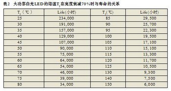 表2是Edison公司给出的大功率白光LED的结温TJ在亮度衰减70%时与寿命的关系(不同LED生产厂家的寿命并不相同,仅做参考)。