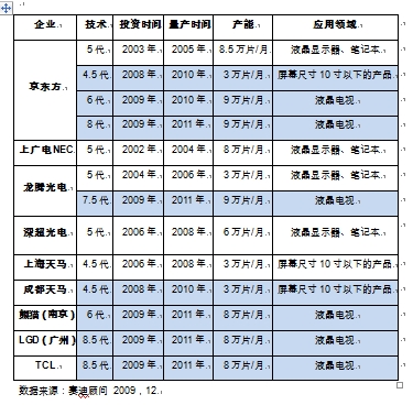 即将过去的2009年可以说是中国LCD面板产业投资的高峰年,据赛迪顾问统计,仅2009年投资(或拟投资)的LCD面板生产线就多达6条,面板生产线的世代覆盖了6至8.5代,参与投资的企业除了传统的面板生产厂商如京东方、龙腾光电等,还涉及到一些新进入的企业,如中电熊猫、TCL等,其中也不乏一些外资企业的身影,如LGD在广州投资的8.5代线。