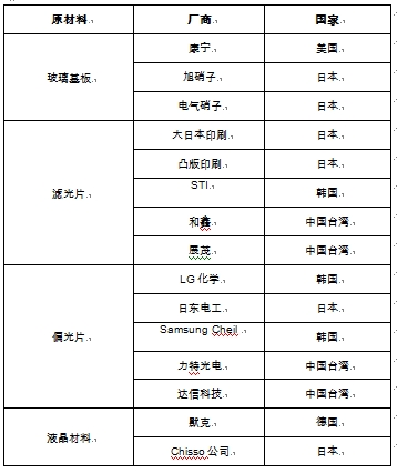 表2 全球主要液晶面板原材料供应商