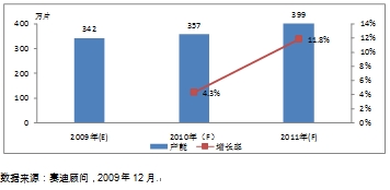 图1 2009-2011年中国LCD面板产能规模及增长率(以玻璃基板为单位计算)