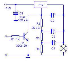 LM317常用作电压稳压器中的调整元件,这里给大家介绍一个不寻常的应用,只要配上不多的外部元件,可以使一个12V的小灯泡闪烁发光。