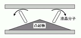 如图,它依*叫做Protrusion的屋脊状凸起物来使液晶本身产生一个预倾角(Pre-tilt Angle)。这个凸起物顶角的角度越大,则分子长轴的倾斜度就越小。早期的VA模式液晶凸起物只在一侧,後期的MVA凸起物则在上下两端。