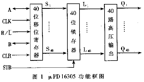 为了解决高压芯片的散热问题,μPD16305将高压输出对称地放置到芯片的两端;为便于电路的安装、调试,将控制管脚放置到芯片的同一侧。ΜPD16305的功能结构可分为三部分:40位双向移位寄存器、40位锁存器和高压输出功能块。它除了有40路的高压输出以外,还有一个低压的输入和一个低压的输出。并且这两个输入输出端口都是双向的,当一个为输入时,另一个为输出,其输出是移位寄存器输入相连,可以级联驱动40路以上的显示器。对于分辨率为852×480的PDP来说,只需12片μPD16305的主要功能块。