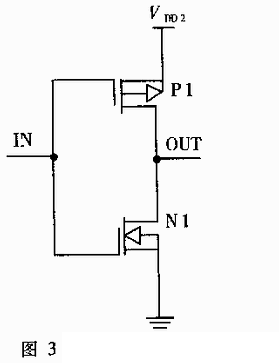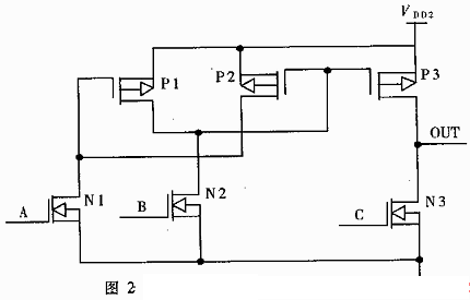 当A=0、B=1、C=0时,N2、P2、P3导通,N1、P1、N3截止,输出OUT=VDD2。